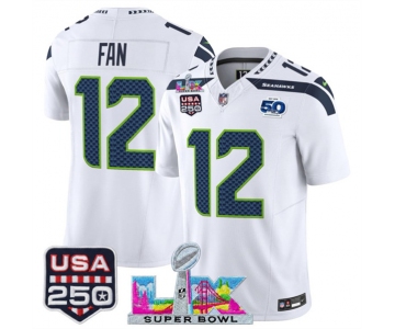 Men's Seattle Seahawks #12 Fan White 2025 F.U.S.E. Super Bowl LX Patch And 50th Season & USA 250' Patch Vapor Limited Football Stitched Jersey