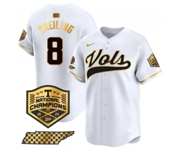 Men's Tennessee Volunteers #8 Dylan Dreiling White Gold 2024 Champions Vapor Limited Baseball Stitched Jersey
