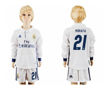 Real Madrid #21 Morata Home Long Sleeves Kid Soccer Club Jersey