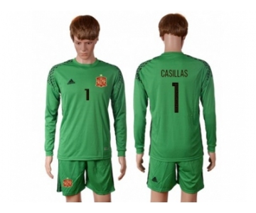 Spain #1 Casillas Green Goalkeeper Long Sleeves Soccer Country Jersey