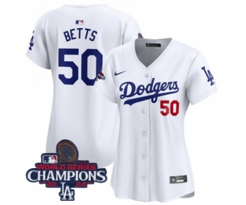 Your Position: Home>NIKE MLB Jerseys>2024 World Series Champions>Women >Women Nike Los Angeles Dodgers Mookie Betts #50 White Flex Base 2024 World Series Champions Stitched MLB Jersey