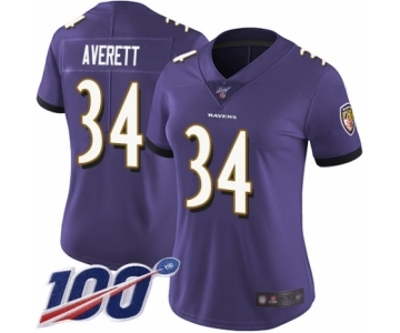 Women's Baltimore Ravens #34 Anthony Averett Purple Team Color Vapor Untouchable Limited Player 100th Season Football Jersey