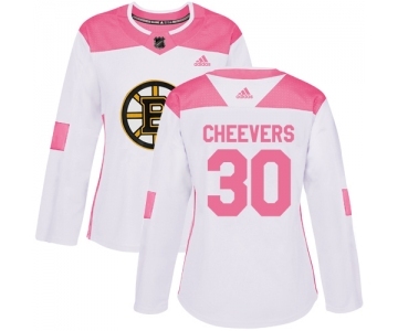 Women's Boston Bruins #30 Gerry Cheevers Authentic White Pink Fashion Hockey Jersey