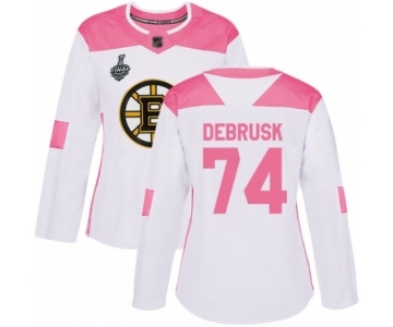 Women's Boston Bruins #74 Jake DeBrusk Authentic White Pink Fashion 2019 Stanley Cup Final Bound Hockey Jersey
