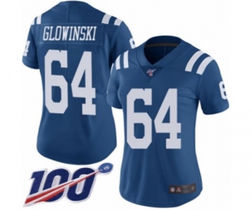 Women's Indianapolis Colts #64 Mark Glowinski Limited Royal Blue Rush Vapor Untouchable 100th Season Football Jersey