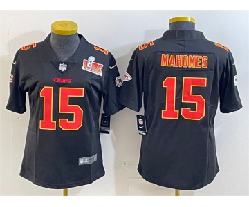 Women's Kansas City Chiefs #15 Patrick Mahomes Black 2025 Super Bowl LIX Patch Vapor Untouchable Limited Stitched Football Jersey