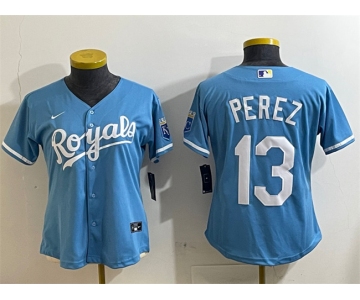 Women's Kansas City Royals #13 Salvador Perez Light Blue Cool Base Stitched Jersey