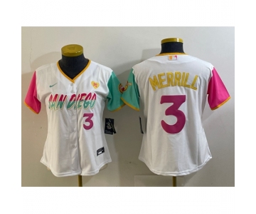 Women's San Diego Padres #3 Jackson Merrill Number White Heart 2024 City Connect Cool Base Stitched Jersey