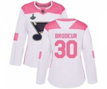 Women's St. Louis Blues #30 Martin Brodeur Authentic White Pink Fashion 2019 Stanley Cup Champions Hockey Jersey