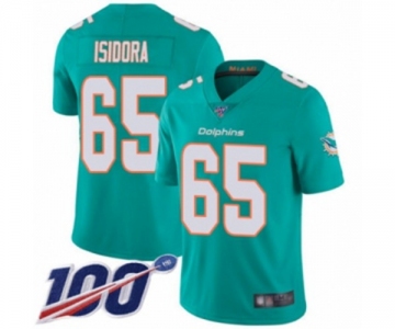 Youth Miami Dolphins #65 Danny Isidora Aqua Green Team Color Vapor Untouchable Limited Player 100th Season Football Jersey
