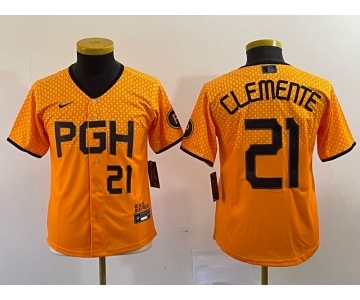 Youth Pittsburgh Pirates #21 Roberto Clemente Number Yellow 2023 City Connect Stitched Jersey